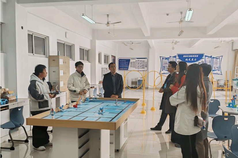 在电气自动化系实验室,张源老师向罗静雅一行详细介绍展示了无人机足球和编程智能车的相关技术及开展现状。近年来围绕青少年无人机和科技竞赛,张源老师联合电气自动化系和校团委积极对接企业,通过专业实践和科技竞赛推动大学生专业学习,有效提升了大学生科研和创新能力。