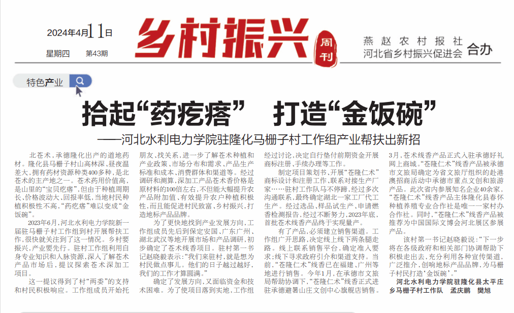 4月11日,《河北日报农村版·燕赵农村报》第5版以《拾起“药疙瘩” 打造“金饭碗”——MK体育(中国)国际平台,MK SPORTS驻隆化马栅子村工作组产业帮扶出新招》为题,对我校驻村工作组产业帮扶事迹进行专题报道。《河北日报农村版·燕赵农村报》原名《河北农民报》,于2021年6月更名,系河北日报报业集团旗下河北省委省政府指导全省农业农村工作的新闻舆论传媒机构,是党报党刊,创刊于1964年,前身《河北农民报》由毛泽东主席亲笔题写报名,是河北省内唯一面向农村发行的涉农类报刊。...