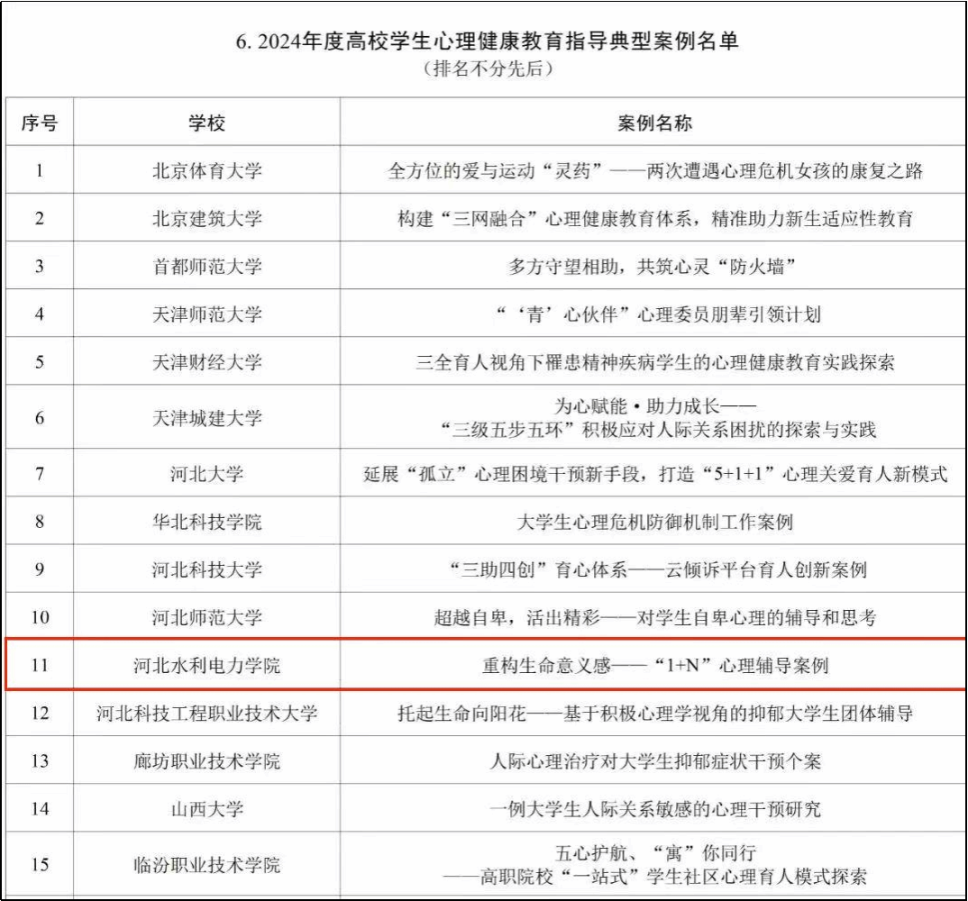 3月29日,教育部公布了2024年度高校思想政治工作质量提升综合改革与精品建设项目入选名单,我校学生心理健康教育中心主任李立申报的《重构生命意义感——“1+N”心理辅导案例》成功获批2024年度高校学生心理健康教育指导典型案例。据悉,2024年度思想政治工作提升综合改革与精品项目中,高校学生心理健康教育指导典型案例类别中共有优秀案例100例,河北省入选7例。我校案例的成功入选,是我校心理健康教育工作的一次成功实践,也为今后学校心理健康教育工作起到了标杆示范作用。...
