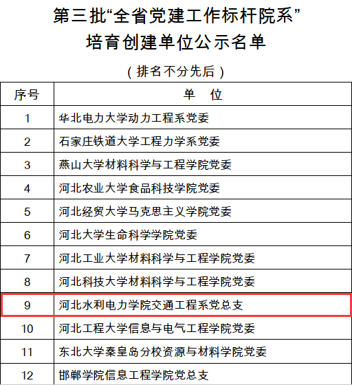 近日,中共河北省委教育工作委员会公布了全省第三批新时代高校党建示范创建和质量创优工作遴选结果,我校交通工程系党总支在众多高校院系竞争中脱颖而出,成功获批第三批“全省党建工作标杆院系”培育创建单位。近年来,交通工程系党总支在学校党委的坚强领导下,紧紧围绕“一融双高”的总目标,坚决贯彻学校党委决策部署,全面落实“围绕中心抓党建,抓好党建促发展”工作理念,打造“红椒通衢”培育工程党建品牌,不断探索基层党建创新,...