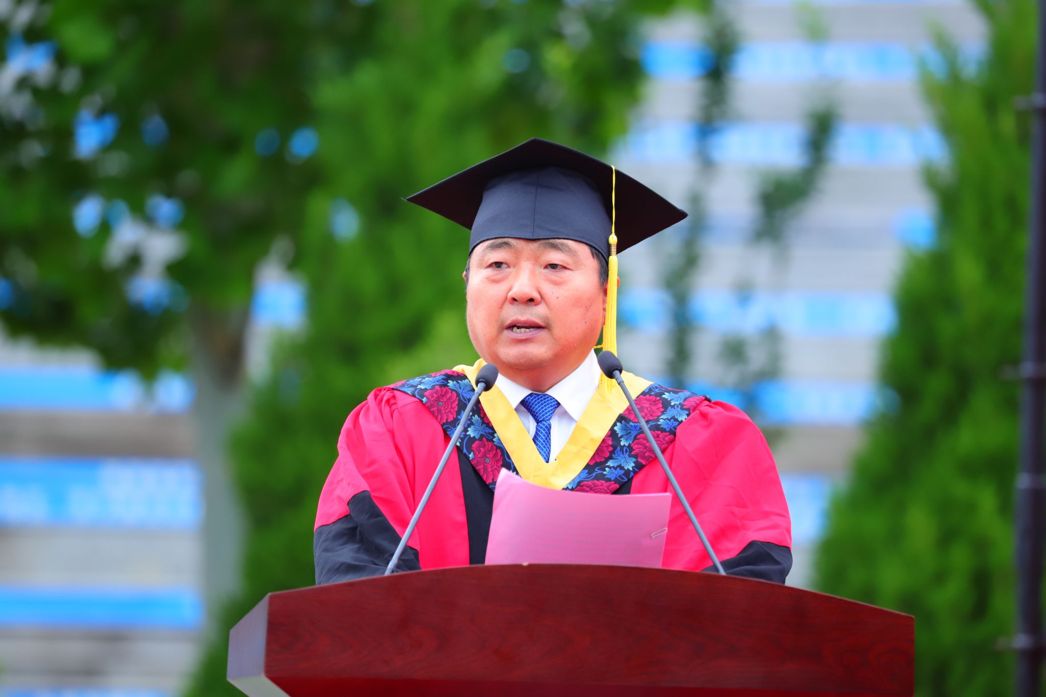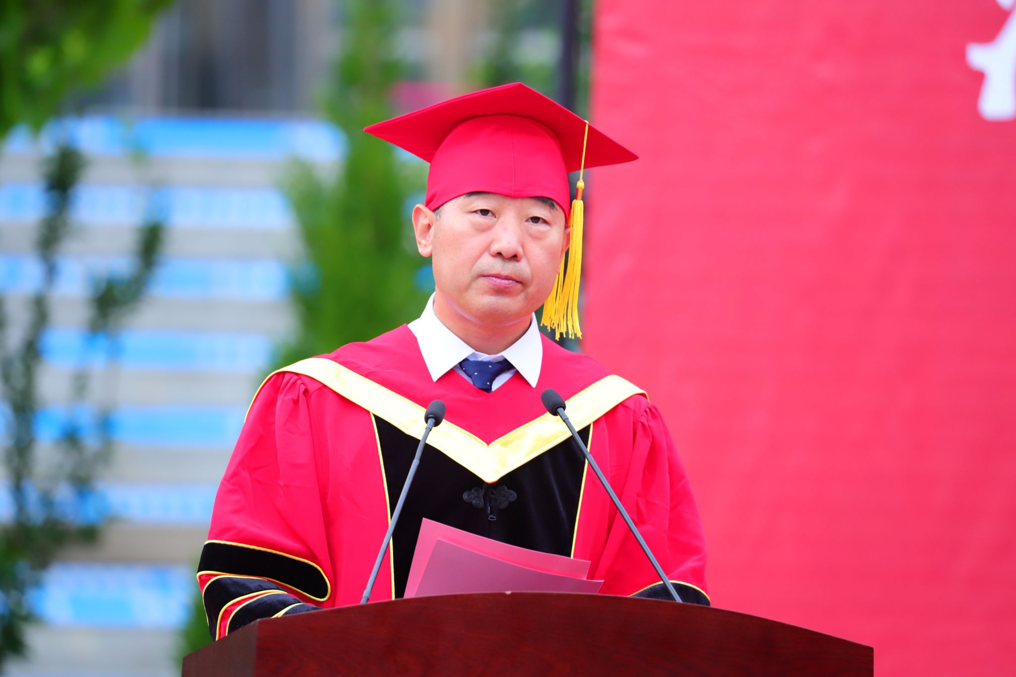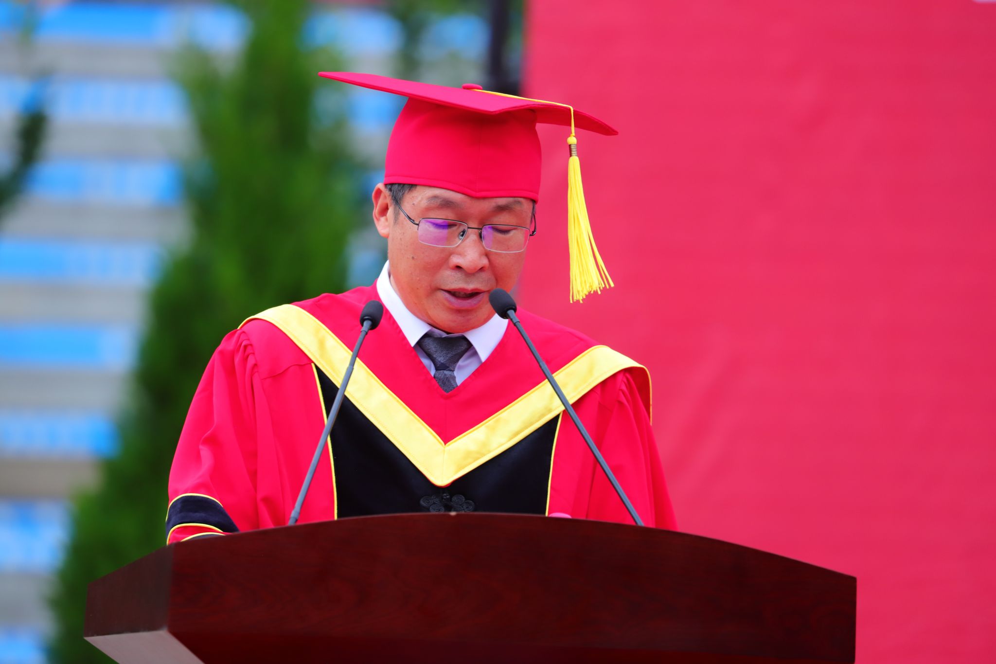典礼上,党委副书记、校长王滨以《菁菁水院绽芳华 乘势扬帆启新程》为题发表了热情洋溢的讲话。他代表学校向2685名2025届毕业生圆满完成学业表示热烈的祝贺,回顾了毕业生们在校期间的点点滴滴,肯定了大家的努力与进步,并从“一是你我向上,家国向前——希望你们永远胸怀家国,将个人奋斗汇入时代洪流。二是学而不止,行以致远——希望你们永远勤学不怠,在社会大课堂求知探源。三是百舸争流,奋楫者先——希望你们永远砥砺奋斗,在时代最前沿百炼成钢。”等三个方面对毕业生们提出了殷切期望和谆谆教诲,希望毕业生们在变革的时代把握好人生前行的方向,既要仰望星空、志存高远,把爱国之情、报国之志与个人理想抱负紧密结合,在服务国家发展和人民福祉的实践中彰显青春风采、贡献青春力量;也要脚踏实地、行稳致远,保持乐观积极、包容豁达的心态,勇于做困难而真正有价值的事,不过分在意一时之快慢、一事之成败,坚持在运动中保持健康、在阅读中丰盈内心、在交流中拓宽视野,以美好自我创造出更加美好的未来。