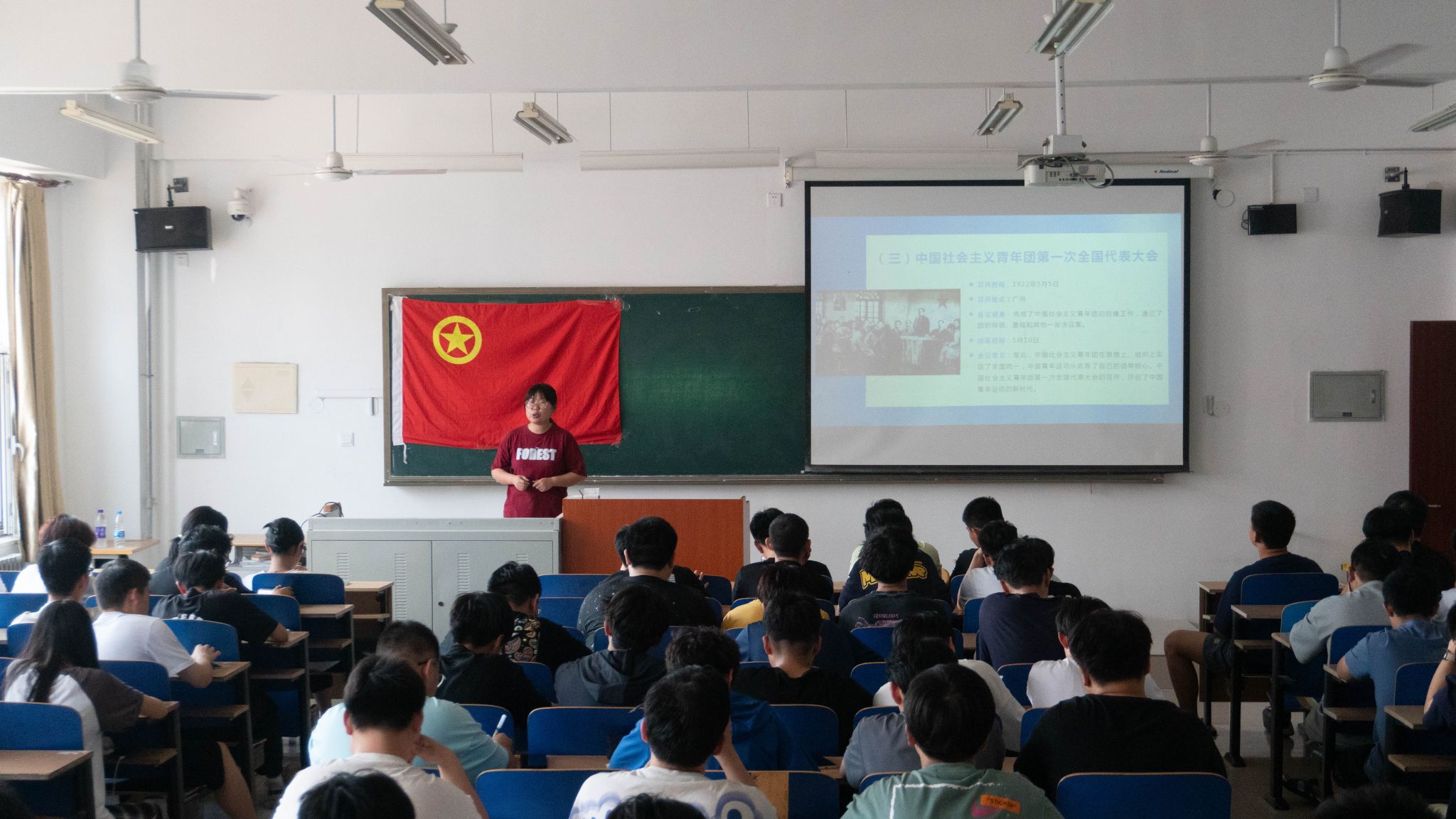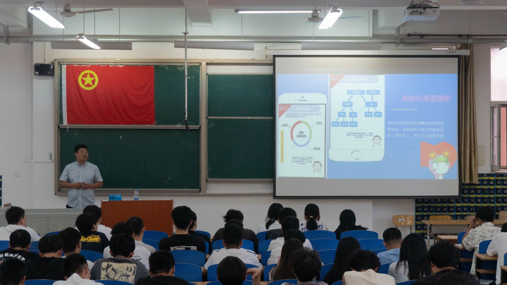 团课上,机械工程系党总支副书记杨学智以“百年团史与青年奋斗”为主题,以青年团的三个主要发展阶段为切入点,从1920年8月社会主义青年团在上海的建立,到1925年1月召开的中国社会主义青年团第三次全国代表大会上“中国共产主义青年团”名字的确定,到现在党的十一届三中全会之后,共青团跟着党走上改革开放道路,焕发新的生机。一百年来,中国共产党领导中华民族复兴伟业劈波斩浪、壮丽远航,中国共青团团结带领一代代中国青年奋勇争先,在党的事业和民族复兴征程中,书写了无上的青春荣光。