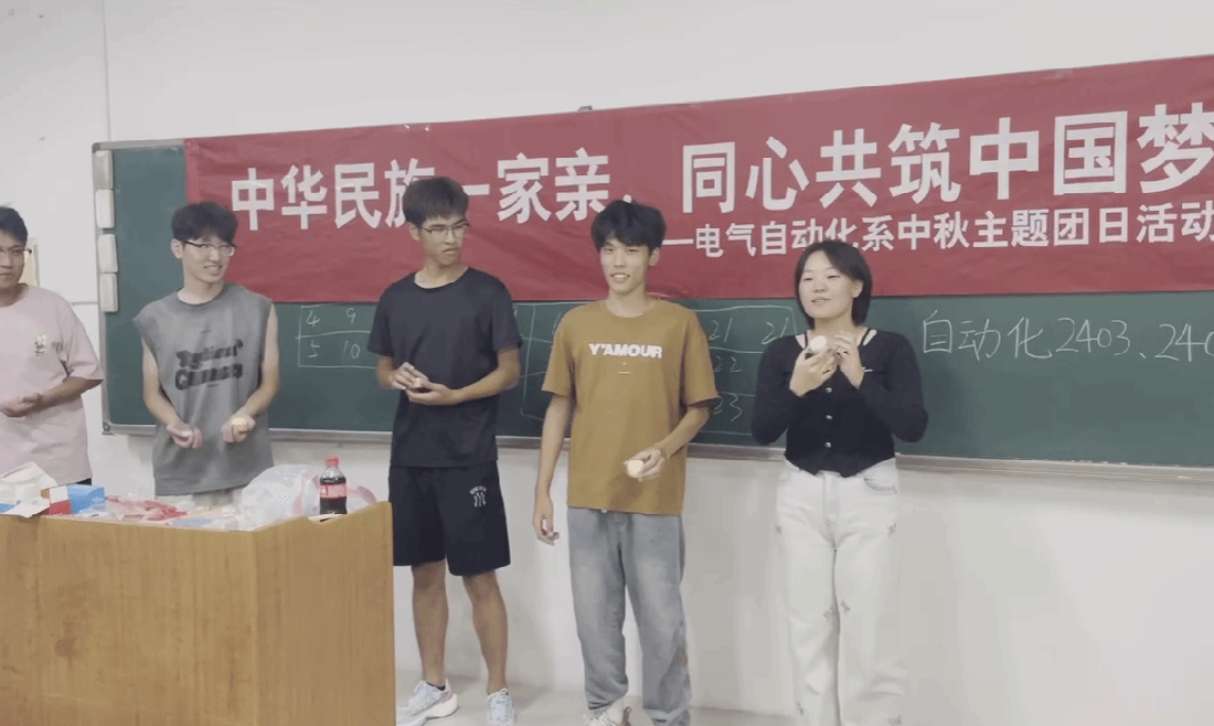 为弘扬中华民族优秀传统文化,增强同学们的民族认同感和团结意识,9月14日,电气自动化系精心组织了一场以“中华民族一家亲,同心共筑中国梦”为主题的中秋主题团日活动。此次活动由王静静老师主持,自动化2403、自动化2404班的同学们积极参与,共同体验传统节日的魅力。