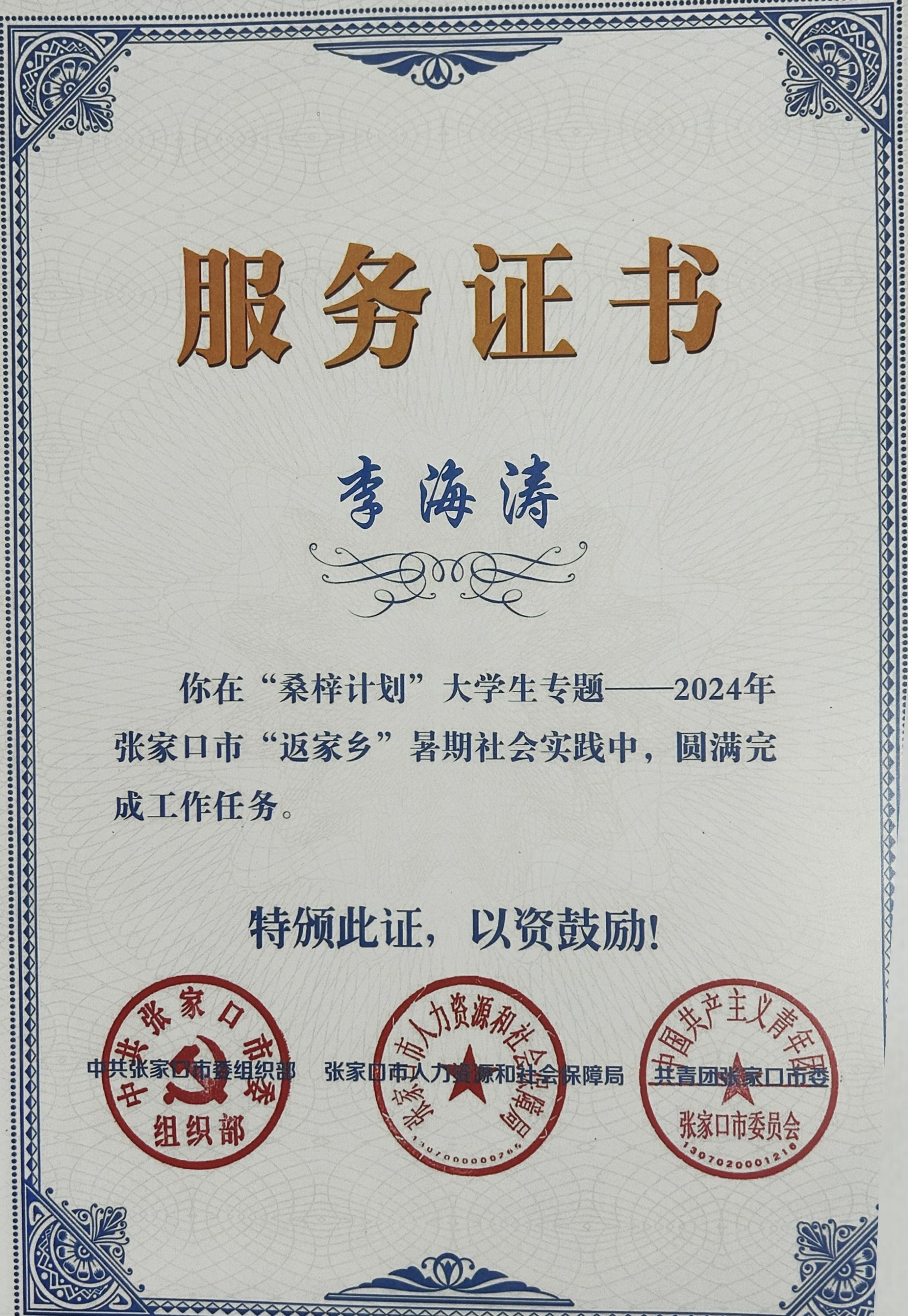 近日,社会实践工作传来喜讯,机械工程系学生李海涛在今年暑期社会实践活动中表现突出,荣获张家口涿鹿县共青团委的高度评价与表彰,被授予“优秀志愿者”荣誉称号,并收到涿鹿县共青团委的感谢信