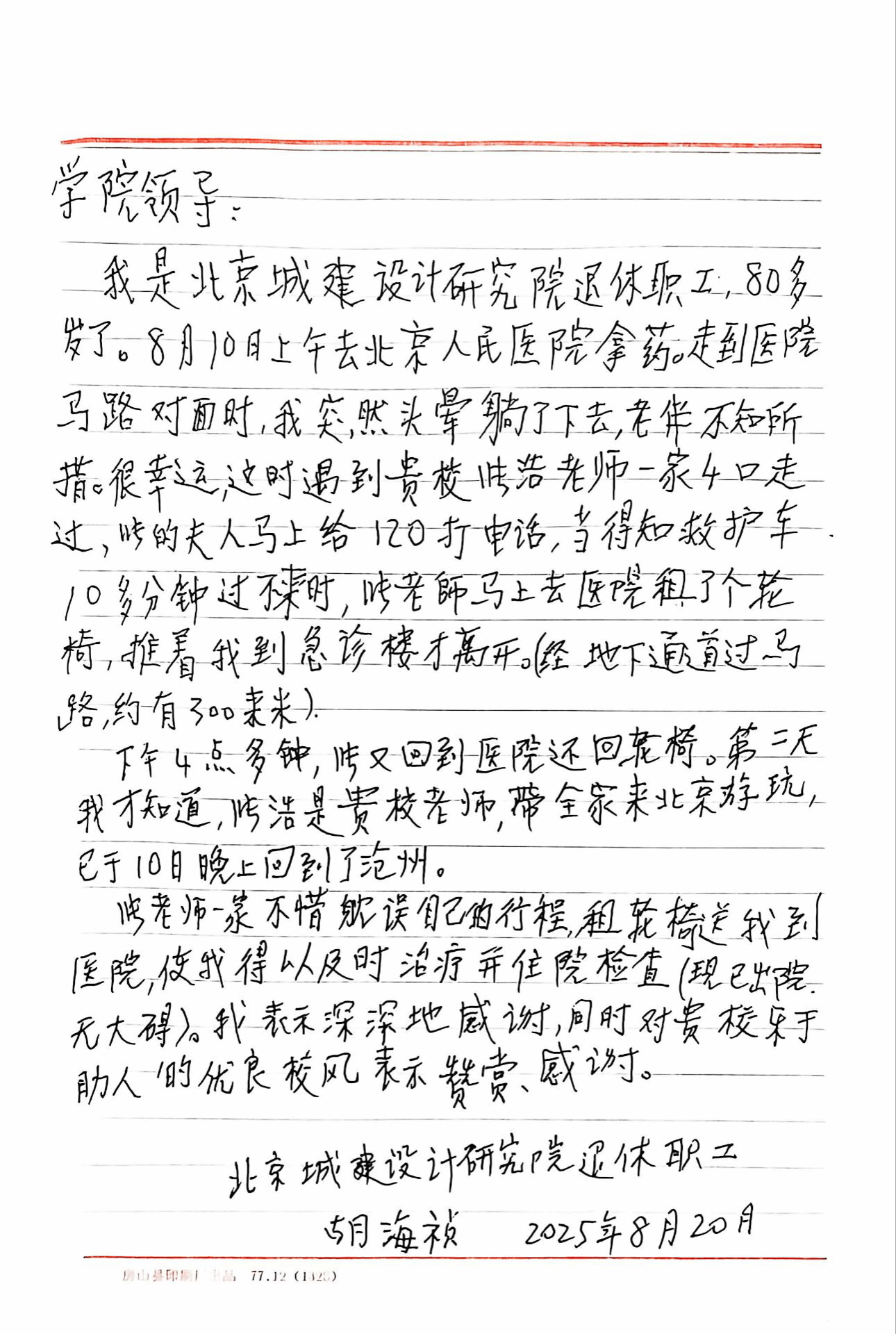 “我们一定要好好谢谢张老师一家,是他们救了我的命!”2025年8月下旬,我校收到一封特殊的手写感谢信。信纸上的字迹略显颤抖,却一笔一画写得极其认真——那是北京城建设计研究院八旬退休职工胡海祯老人,在出院后用布满皱纹的双手,一字一句写下的心声。信中,老人反复表达对张浩老师一家的感谢。这封沉甸甸的感谢信,为我们揭开了一段“生命守护”的暖心故事。