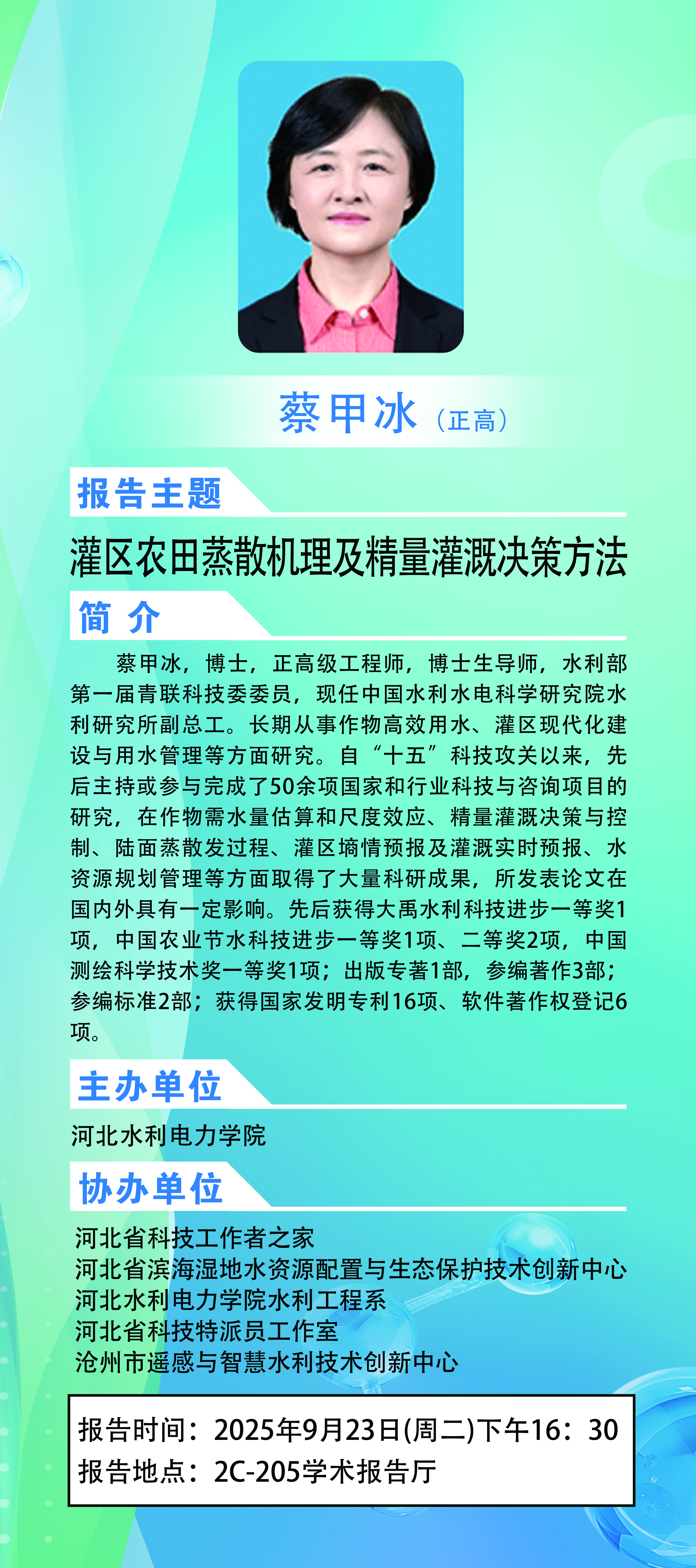 【学术活动预告】灌区农田蒸散机理及精量灌溉决策办法(主讲人:蔡甲冰博士)